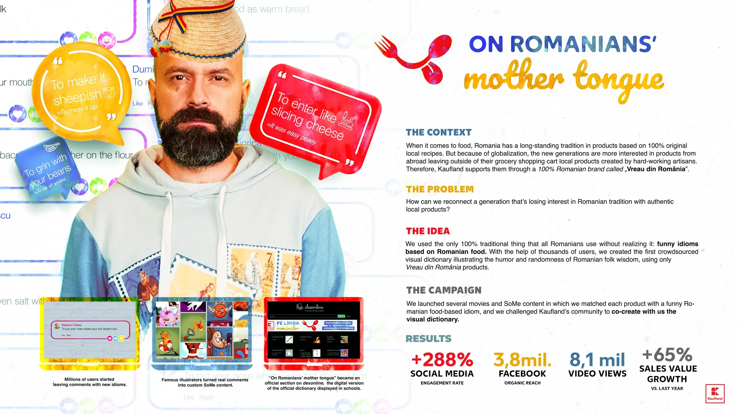 Because of globalization, the new generation of Romanians is more interested in food products from abroad, leaving local products created by hard-working artisans outside their grocery shopping cart. Therefore, Kaufland supports local craftsmen through a 100% Romanian brand called „Vreau din România,” created in partnership with them. To reconnect a generation losing interest in Romanian tradition with authentic local products, we used the only 100% traditional thing that all Romanians use without realizing it: funny idioms based on Romanian food. With the help of thousands of users, we created the first crowdsourced visual dictionary illustrating the humor and randomness of Romanian folk wisdom, using only „Vreau din România” products.